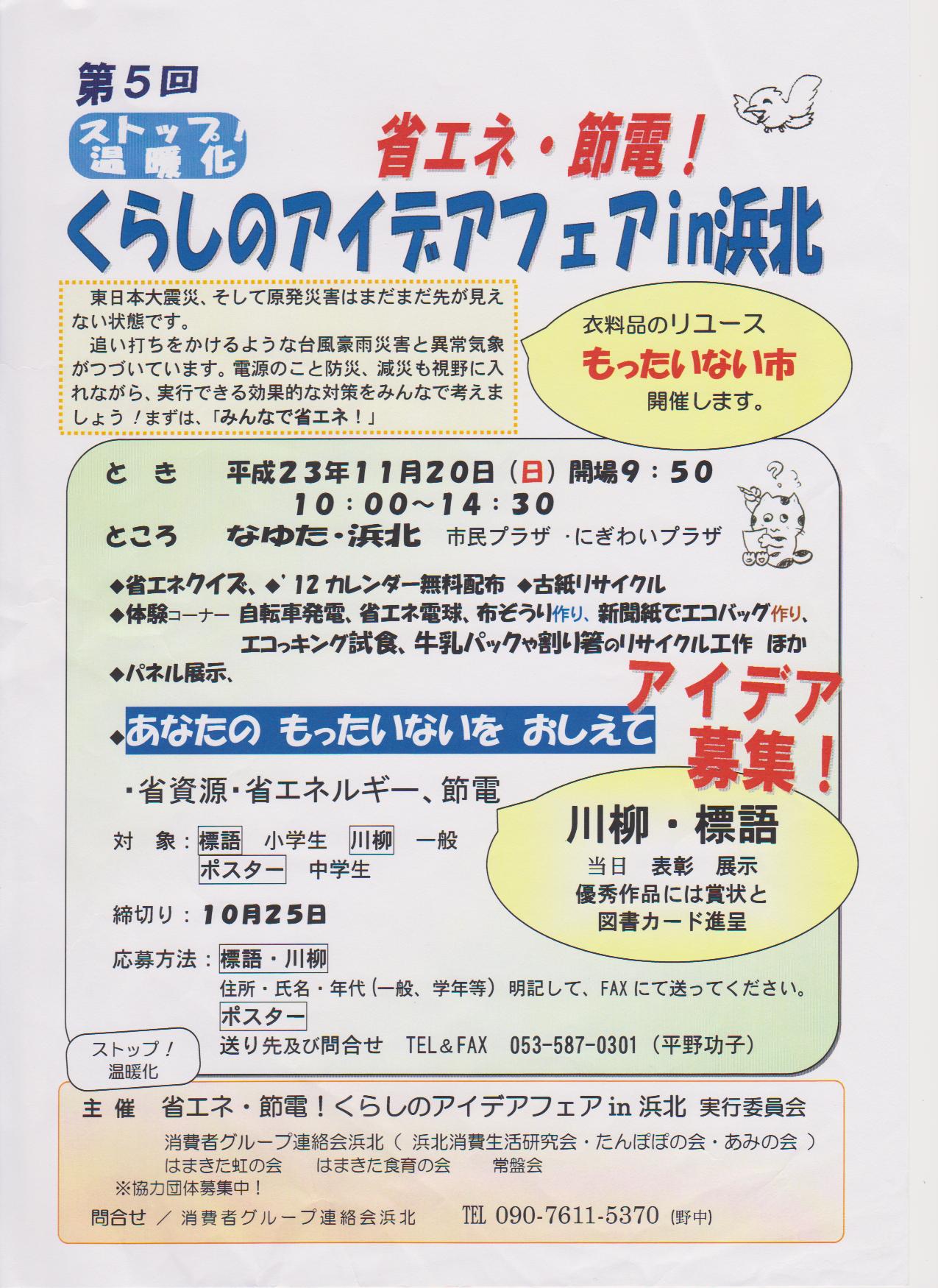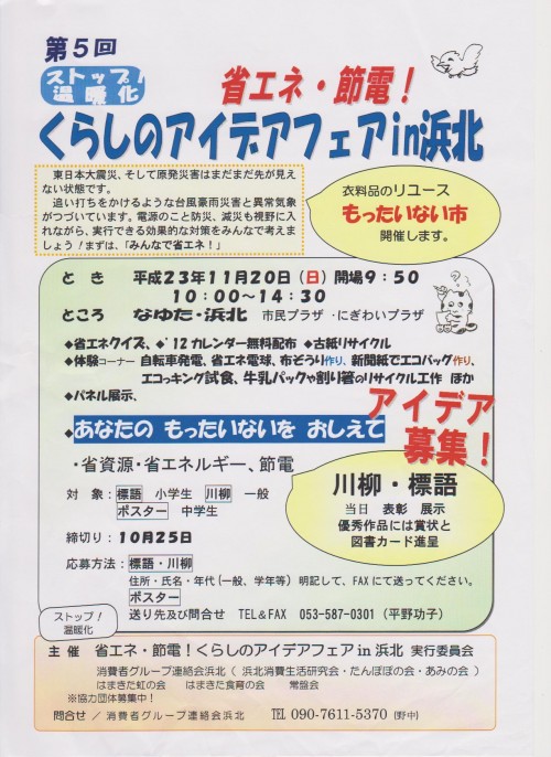 「みんなで省エネ!」を実行しようと消費者グループ連絡会浜北が平成23年11月20日(日)に『省エネ・節電!くらしのアイデアフェアin浜北』を開催します。